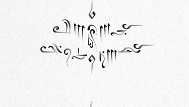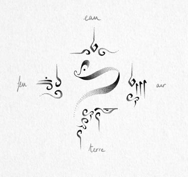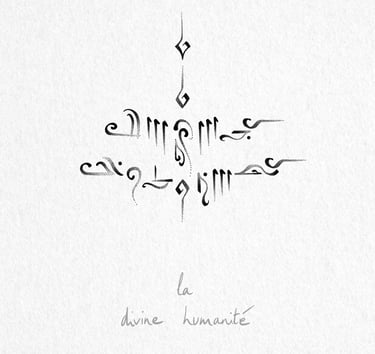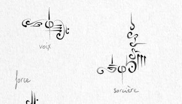 Je dessine ces Tatouages Sigillaires à l'aide d'une ou deux roues alphabétiques. Chaque dessin contient subtilement les lettres du mot dit. Le résultat donne une figure abstraite et illisible par les autres, qui synthétise l’intention du mot. Cela peut fonctionner pour plusieurs mots.